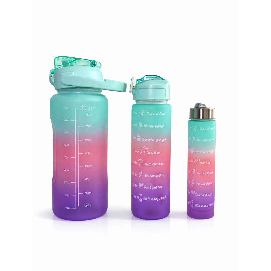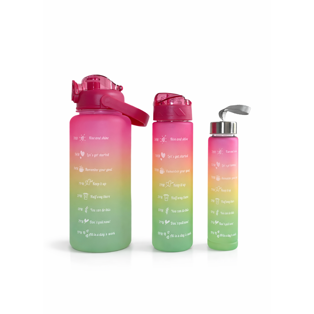 Set de 3 botellas con diseños motivacionales, ideales para mantenerte hidratado en casa, el trabajo o durante tus actividades deportivas. Resistentes, prácticas y fáciles de limpiar. Compactas y perfectas para todos los días.