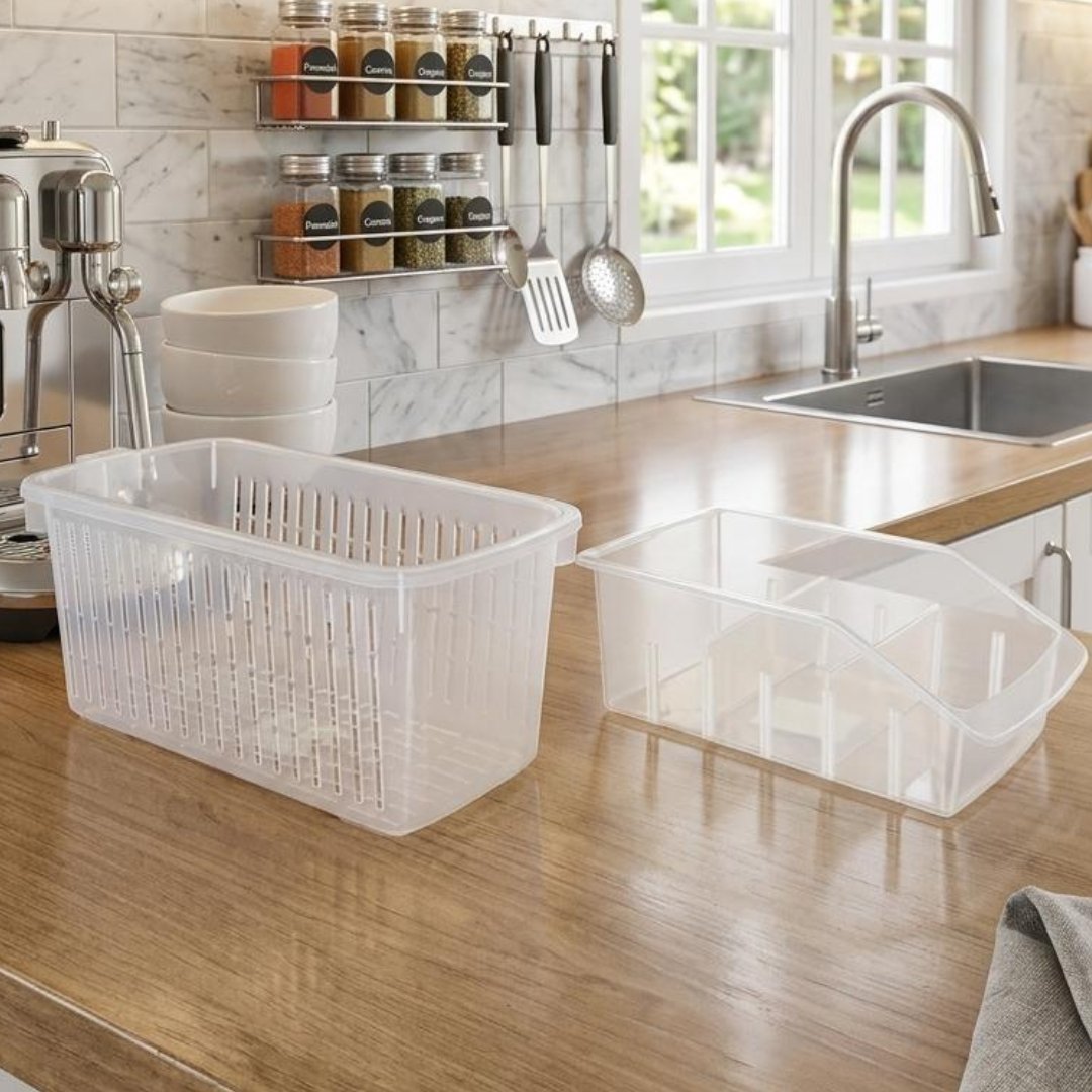 Práctico set de escurridores de vegetales y organizadores de plástico, ideal para lavar, escurrir y almacenar verduras, frutas y otros alimentos de manera ordenada y eficiente. Perfecto para mantener la cocina limpia y organizada.