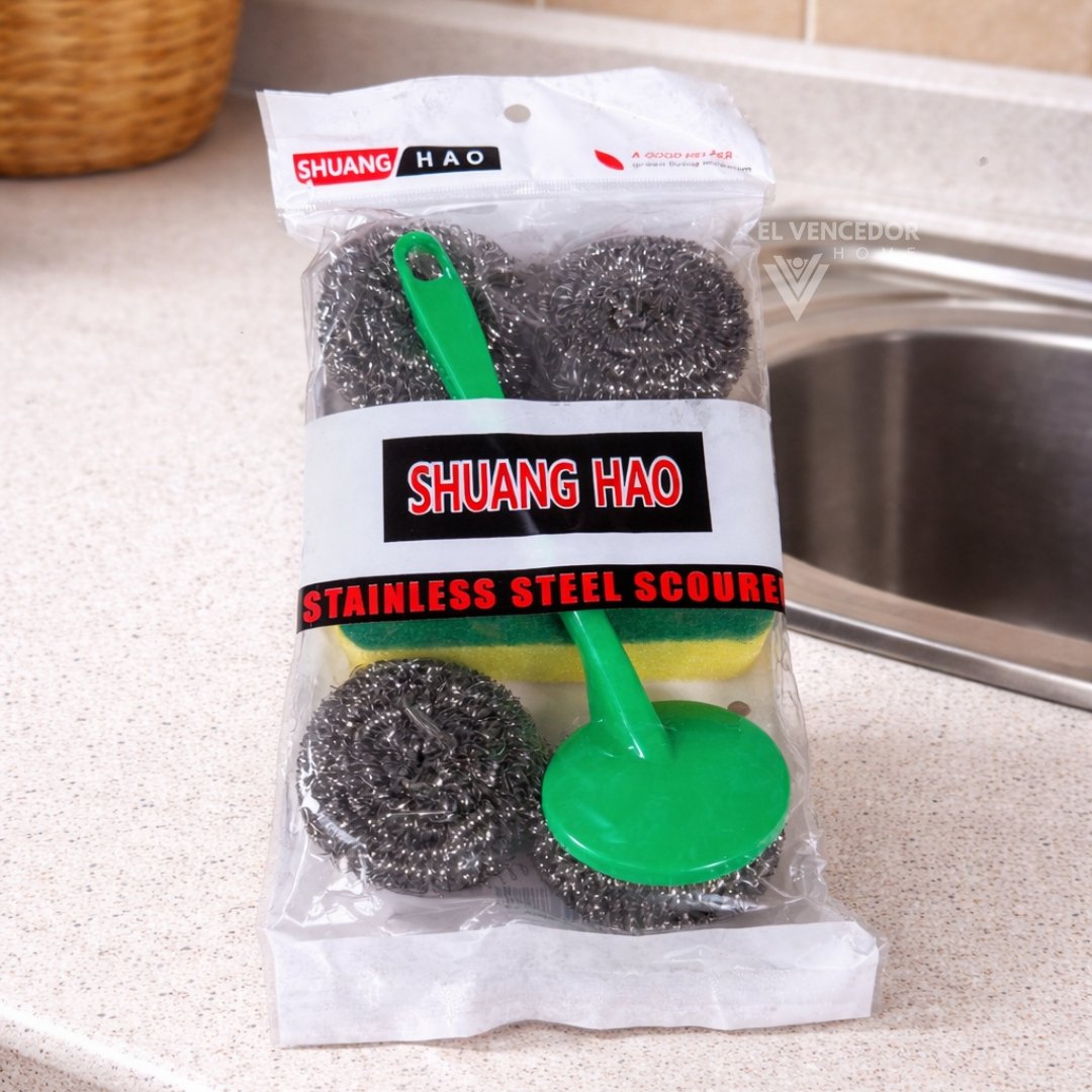 Kit de esponjas de metal y fibras, con mango de plástico, ideal para limpiar de manera efectiva superficies difíciles o de uso intensivo. Su diseño cómodo y resistente permite un agarre seguro, facilitando la tarea de fregar platos, utensilios o incluso ollas y sartenes con mayor facilidad.