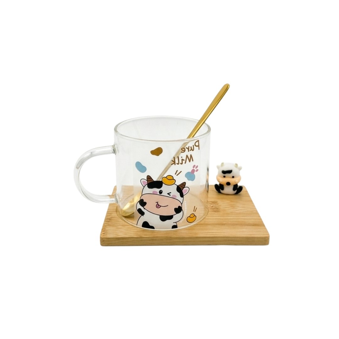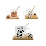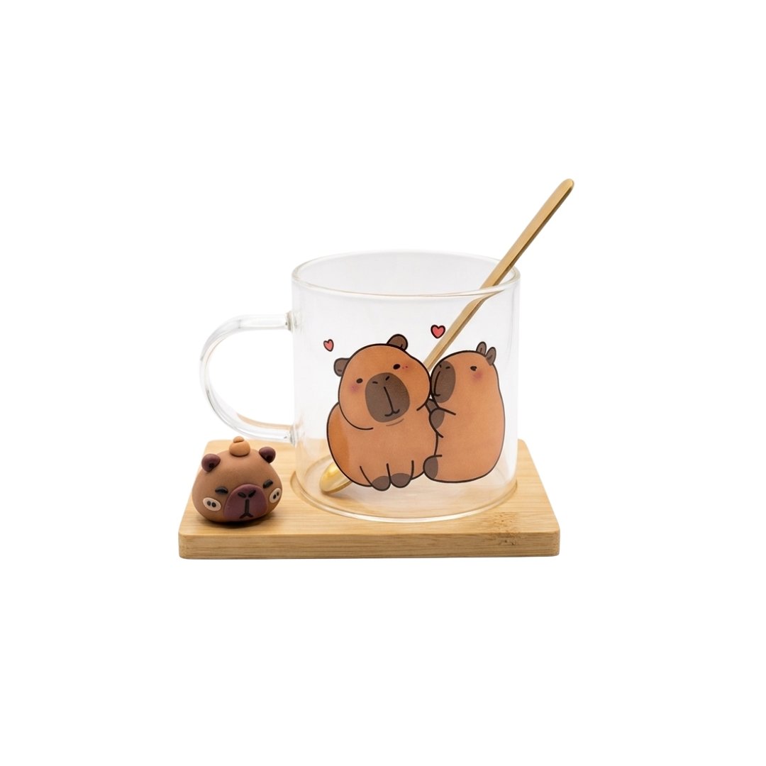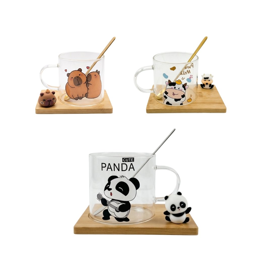Taza de cristal decorativa, con cucharita de metal dorado y base de bambú, con diseño de Capibara y Panda. Perfecta para disfrutar tus bebidas con estilo y un toque adorable.