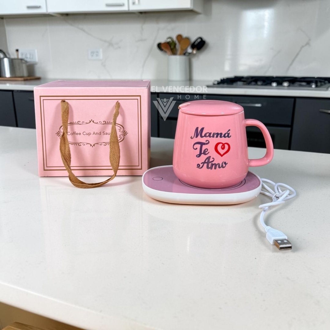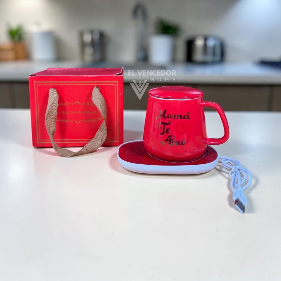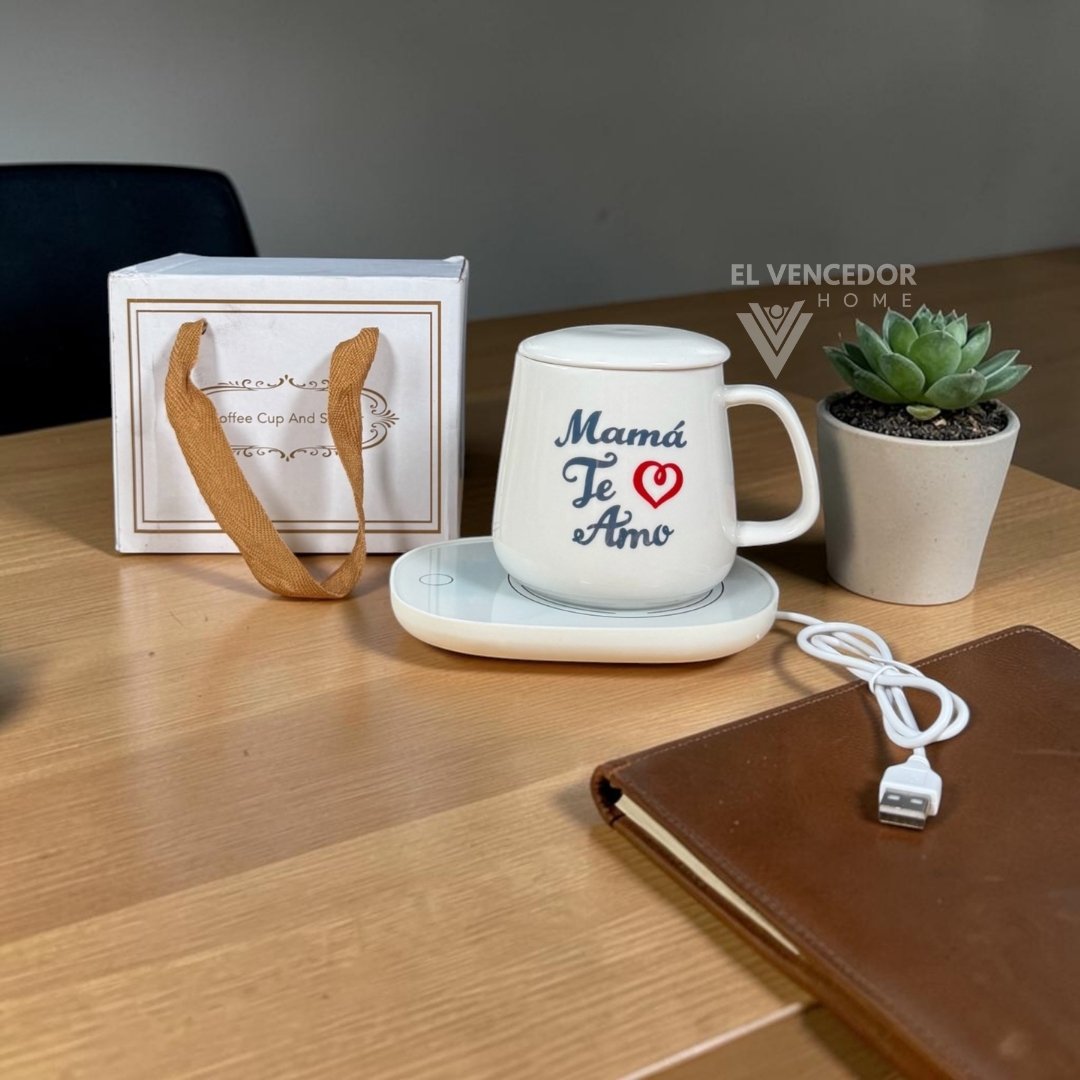 Kit de taza de cerámica con tapa, incluye cucharita de metal dorado y base calentadora, presentado con delicado diseño “Día de la madre”. Ideal para mantener tus bebidas calientes por más tiempo y sorprender con un regalo elegante y funcional. Perfecto para disfrutar de café, té o infusiones con un toque especial.