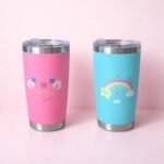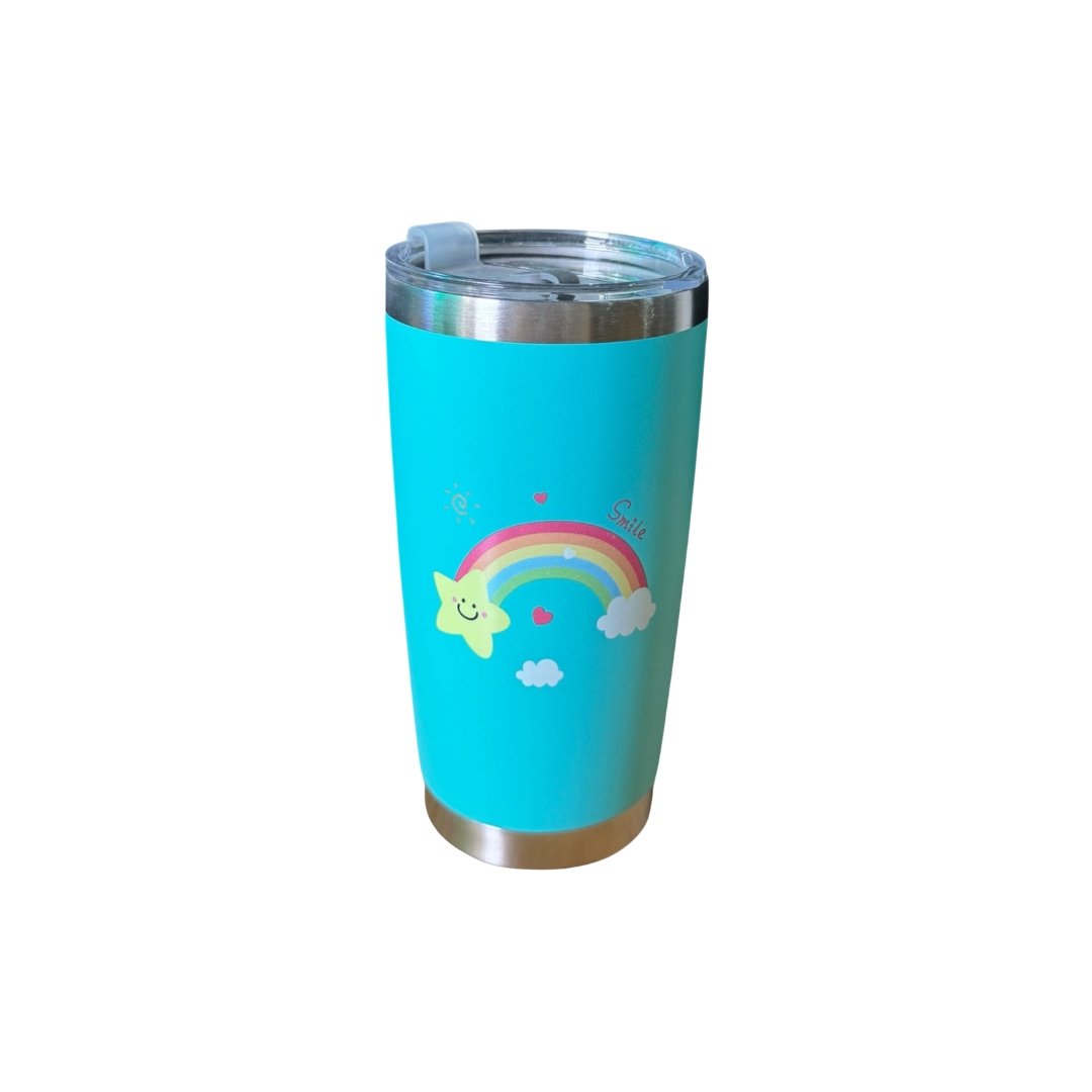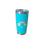 Vaso térmico con diseño infantil en colores fucsia y verde, ideal para mantener la temperatura de las bebidas por más tiempo. Perfecto para niños, ya sea para el colegio, paseos o el uso diario en casa. Su diseño llamativo y práctico lo convierte en una opción divertida y funcional que no está disponible en Canva.